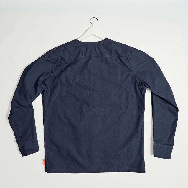 British made 100% Luxury cotton poplin collarless over shirt, ideal for layering, cut and crafted in our little bespoke Manchester workshop, complimented with natural corozo nut buttons,